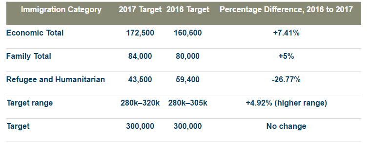 Canada's 2017 immigration plan has the same 300,000 target but the high of the target range was increased to 320,000