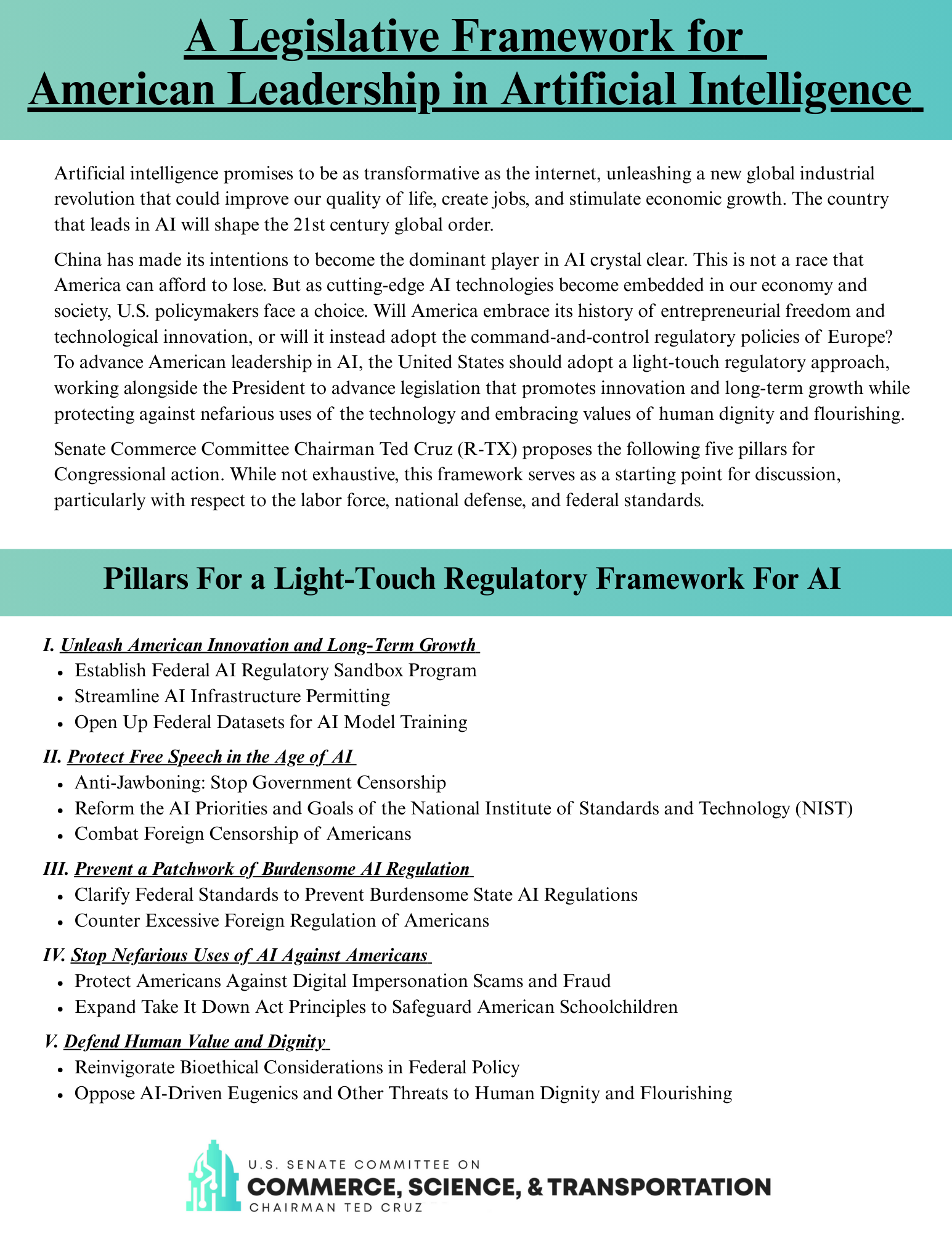 Under the framework, Cruz calls for a "light-touch" regulatory approach to "advance American leadership" in AI and ensure that "American values" are at the heart of the world's leading technology-not Chinese values.