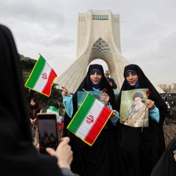 Tehran rallies feature imagery of Iranian missiles and drones from last year's conflict with Israel.