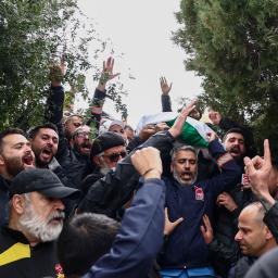 A Lebanese man who returned to southern Lebanon removes the Israeli flag from Beaufort Castle (Qalaat al-Shaqif).
