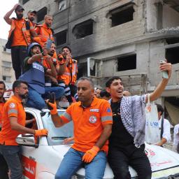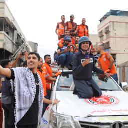 Video shows emergency service crews celebrating the announcement of a ceasefire deal with chants and sirens.