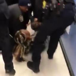 With a crowd of onlookers gathered around, New York Police officers encircle a woman and her child on the ground.