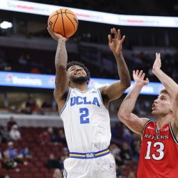 Tyler Bilodeau scored 21 points and Donovan Dent recorded the first triple-double in Big Ten tournament history, leading sixth-seeded UCLA to a 72-59