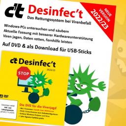 Jetzt mit dem neuen c't-Sonderheft und Desinfec't 2022/23 Trojaner unter Windows jagen und Daten von nicht mehr startenden PCs in Sicherheit bringen.