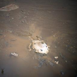 Vor wenigen Tagen ist Ingenuity auf dem Mars zu dem Fallschirm geflogen, an dem er und Perseverance vor einem Jahr gehangen haben. Die Fotos sind beeindruckend.