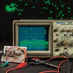 Auf einem analogen Vektor-Display erscheint die Retro-Liniengrafik stilecht in grün auf schwarz. Ein analoges X-Y-Oszilloskop eignet sich dafür hervorragend.