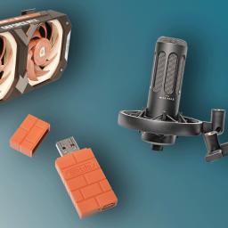 Übertaktete RTX 3070 mit extragroßem Kühler, USB-Adapter für Wireless-Gamecontroller an Nintendo Switch und Mikrofone von Beyerdynamic für Sprache und Gesang.