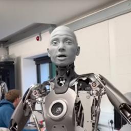 Ameca sieht aus wie ein Roboter, besitzt aber ein menschlich wirkendes Gesicht, mit dem er menschliche Mimik nachahmen kann.