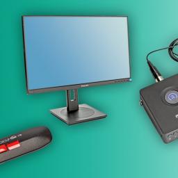 Ein schneller USB-Stick von Teamgroup, der Büromonitor 242B1V von Philips mit eingebautem Privacy-Modus und ein Audiorekorder von Mikme für unterwegs.
