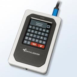 Die robuste externe SSD Datalocker DL4 entsperrt man durch Eingabe des Passwortes auf dem Touchscreen des Gehäuses. So sind Daten auch bei Geräteverlust sicher.