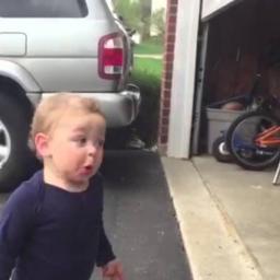 In a clip from America’s Funniest Home Videos, a toddler reacts with total amazement at seeing a garage door opening.