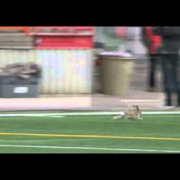 During a Canadian Football League game between the Edmonton Eskimos and Calgary Stampeders this past Monday, a frisky jackrabbit stormed the field at McMahon Stadium in Calgary, Alberta and showed off by jumping around in the end zone. via reddit