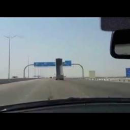 A video uploaded by Mohamed Qutteineh shows truck driving on a Saudi Arabia highway with its box bed raised causing it to crash into a highway sign. via Digg