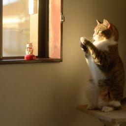 A clever copycat named Taro adorably mimics the endlessly waving Maneki-neko in the window of his 10 Cats home . image via 10 Cats via Tastefully Offensive