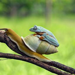 Talented nature photographer Kurito Afsheen has captured remarkable photos of a languid blue-webbed gliding frog hitching a short ride up an ascending branch on the back an accommodating snail during a hot Indonesian day. images via Kurito Afsheen via deMilked
