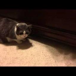 An orange paw that belongs to a sneaky cat who’s hiding under the bed repeatedly steals the treats that are being fed to a bewildered black-and-white cat, who just seems confused by the whole thing.