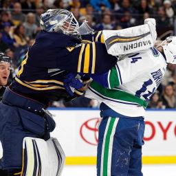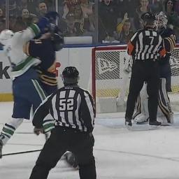 Alex Burrows didn't see it coming.The Vancouver Canucks forward was tackled by Buffalo Sabres defenseman Justin Falk after he went toe-to-toe in a shoving match with goaltender Robin Lehner.For the record, all three players received minor penalties for roughing. Burrows and the Canucks got the last laugh, however, by scoring on the ensuing power play.Copyright © 2017 Score Media Ventures Inc. All rights reserved. Certain content reproduced under license.