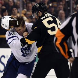 There may be fewer specialists, but there sure are heavyweights.Adam McQuaid and Matt Martin - two players that meet the requirements for the division - exchanged punches at center ice in the second period Saturday in Boston after the Bruins defender wiped out Auston Matthews.McQuaid landed the decisive right hand before the intervention, sending the bloodied Martin in for repair, and presumably to enter concussion protocol.Copyright © 2017 Score Media Ventures Inc. All rights reserved. Certain content reproduced under license.