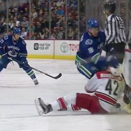 Vancouver Canucks forward Jake Virtanen may be hearing from the NHL's Department of Player Safety on Monday.After a collision with Carolina Hurricanes forward Joakim Nordstrom in the third period Sunday, Virtanen took finishing his check too far, slamming Nordstrom's head into the boards as Nordstrom was sliding helplessly on the ice.No penalty was called on the play. The 'Canes blew a 3-0 lead and lost 4-3 in overtime.Copyright © 2016 Score Media Ventures Inc. All rights reserved. Certain content reproduced under license.
