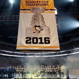 The Pittsburgh Penguins held one more celebration for their title-winning season Thursday prior to their home opener, having captain Sidney Crosby carry the Stanley Cup out for the players to huddle around while watching the franchise's fourth championship banner being raised to the rafters.