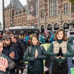 Honderden demonstranten houden het verkeer op de Amsterdamse Stadhouderskade tegen bij het Rijksmuseum. Zij eisen strenger klimaatbeleid.
