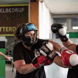 Bokstrainer Hans de Jong wilde wel meewerken aan een bokswedstrijd in het Stedelijk Museum in Schiedam, maar dan moest museumdirecteur Deirdre Carasso wél zelf ook de ring in.