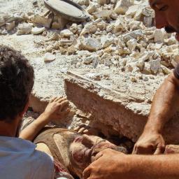 Een man wordt levend onder het puin vandaan gehaald na een bombardement op Maaret al-Numan in de Syrische provincie Idlib. De oorlog in Syrië woedt onverminderd door.