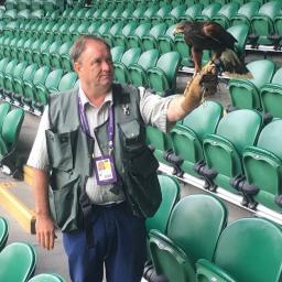 Roofvogel Rufus the Hawk verjaagt de duiven op het tennispark, waar hij koning in de lucht is. „Hij hoort bij de Wimbledon-familie.â€