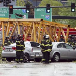 De kraan, die werd gebruikt bij de bouw van een nieuwe vestiging van Google, is vermoedelijk door een windhoos omgevallen. Meerdere auto’s werden daarbij verpletterd.