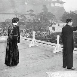 Kroonprins Akihito (rechts) zwaait samen met keizer Hirohito en keizerin Nagako naar burgers vanaf het balkon van het keizerlijk paleis in Tokio op 11 november 1952.