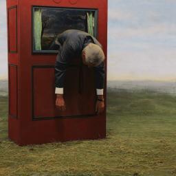 Tussen enkele gekapte bomen speelt een man op een zingende zaag. De foto-schilderijen van Teun Hocks zijn droefgeestig en onweerstaanbaar grappig.