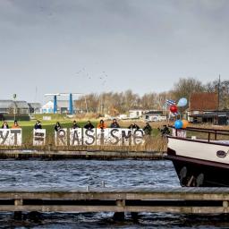 In het Friese Grou is Sint Piter met zijn helper Swarte Pyt aangemeerd. Kick Out Zwarte Piet demonstreerde. Water verving een politielinie.