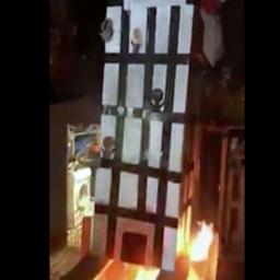 De vijf zijn volgens de politie betrokken bij een video waarin een kartonnen beeltenis van de woontoren onder luid gelach en gejoel in vlammen opgaat.