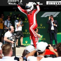 Dankzij een mooie inhaalactie in een spectaculair slot van de race bleef hij thuisfavoriet Lewis Hamilton (Mercedes) en ploeggenoot Kimi Raikkonen voor.