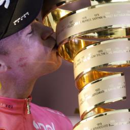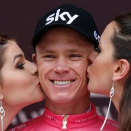 <p>Voor Giro-winnaar Chris Froome was er tijdens de rit roze champagne. Om valpartijen te voorkomen kwam het peloton ver achter de sprinters over de finish. </p>