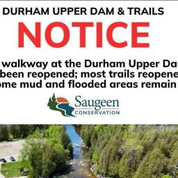 Saugeen Valley Conservation Authority announced late Monday afternoon that the Durham Upper Dam walkway has been reopened along with most trails in that conservation area, although some muddy and flooded areas remain. The trail from McGowan falls to the boat launch remains closed due to flooding, but the remainder of the trails are now open. [...]