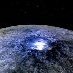 Fresh images from Nasa’s probe reveal sparkly patches on dwarf planet likely to be water vapour emanating from subsurface iceWhen Nasa’s Dawn spacecraft reached the largest object in the asteroid belt earlier this year, mission scientists were baffled to find that the alien terrain gleamed with giant bright spots.The glinting patches on the surface of Ceres sparked an intense debate among astronomers who could not work out if the shiny material was frozen water, reflective salt deposits, or even geysers blasting water vapour into space.