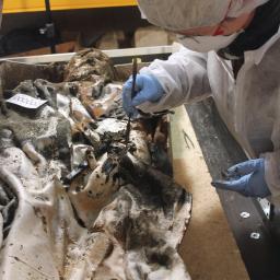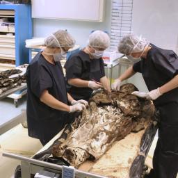 Timelapse video of archeologists at the Rangueil forensic institute in Toulouse analysing the preserved body of 17th century widow Louise de Quengo. Her coffin was unearthed during archaeological excavations at the Convent of the Jacobins in Rennes. Louise de Quengo, of Breton nobility, died in 1656 when she was in her 60s. Her body will be reburied in Rennes in a few months